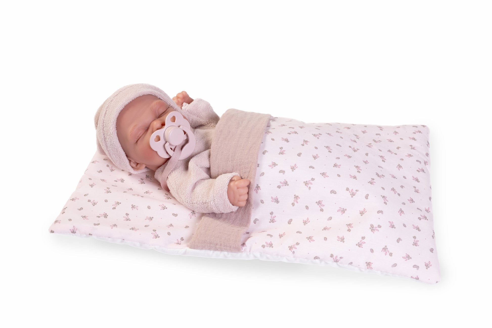 Luni es cuerpo sexuado y con cuerpo de vinil, está en su camita tan tranquilo que se le han cerrado los ojitos para descansar. Con su preciosa pijama y un saquito de flores. Mide 26 cm.