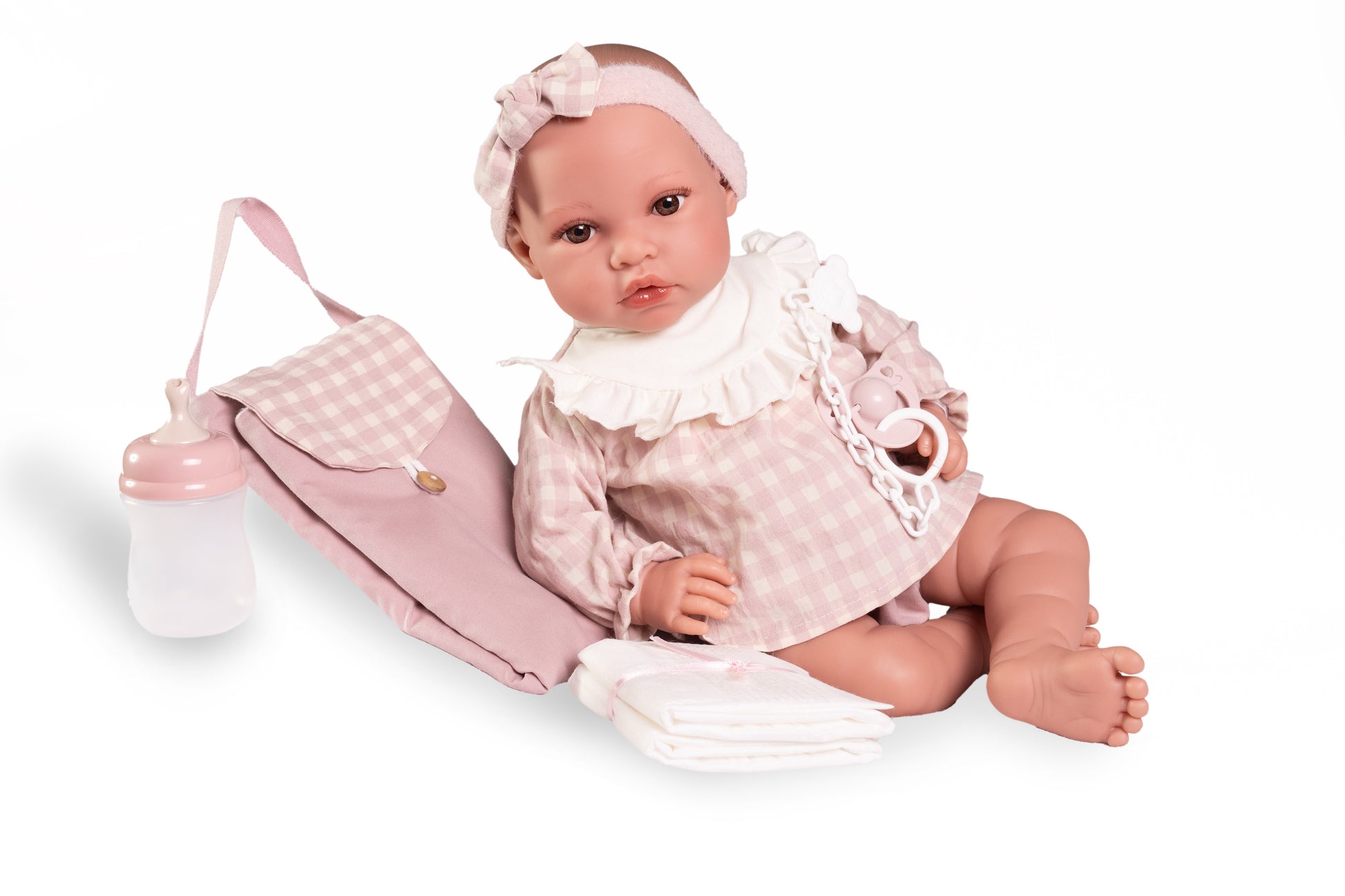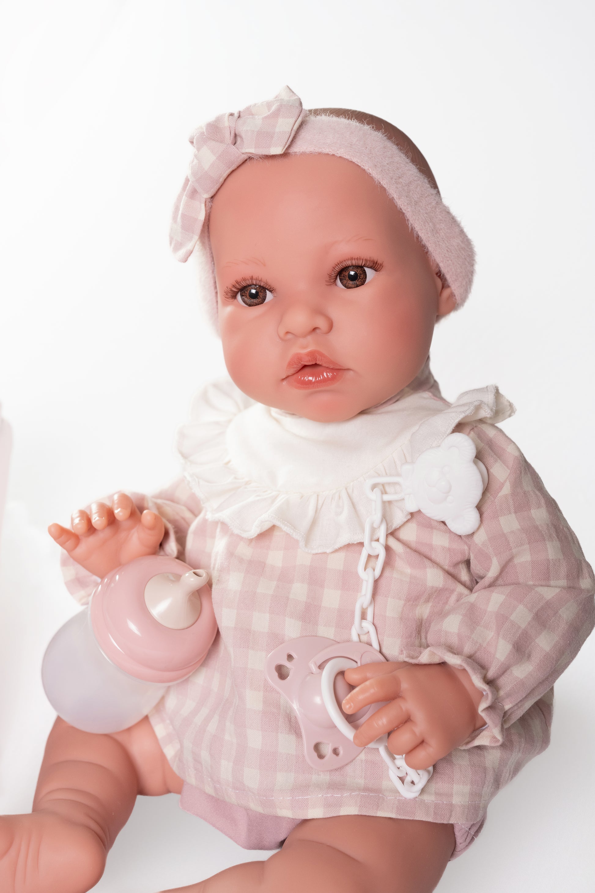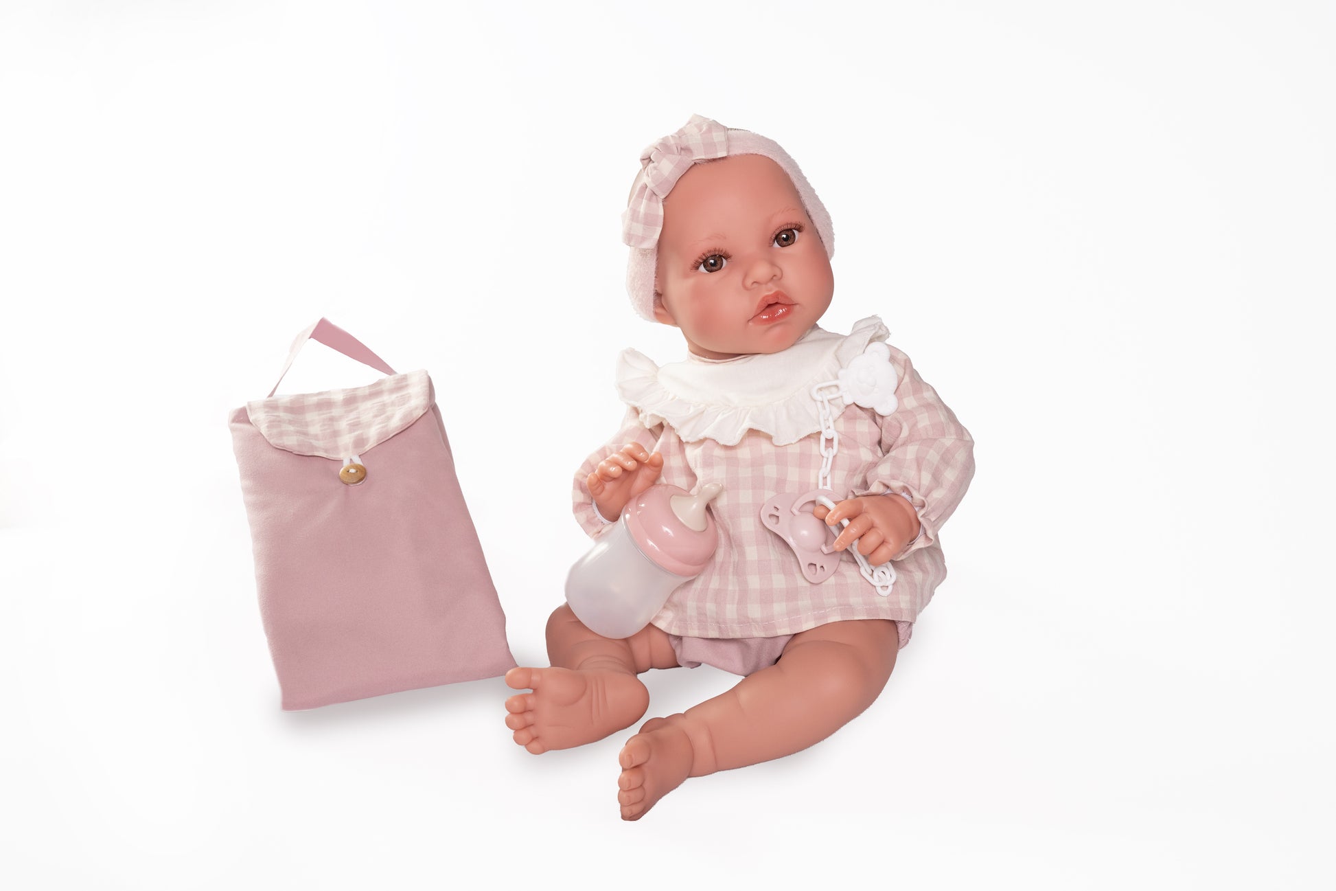 Erika es una dulce bebé con un trajecito de cuadro vichy. Lleva como complemento un cambiador plegable para que puedas cambiarle el pañal cómodamente. Su cuerpo es de tela blandito para poder abrazarla suavemente y su cara y extremidades de suave vinilo. Nuestra Recién Nacida mide 42 cm. ¡Le encantará ir a jugar contigo! Puede colocarse en muchas posiciones como un bebé real porque sus extremidades giran, tiene movimiento, lo que le hace tener más realismo.