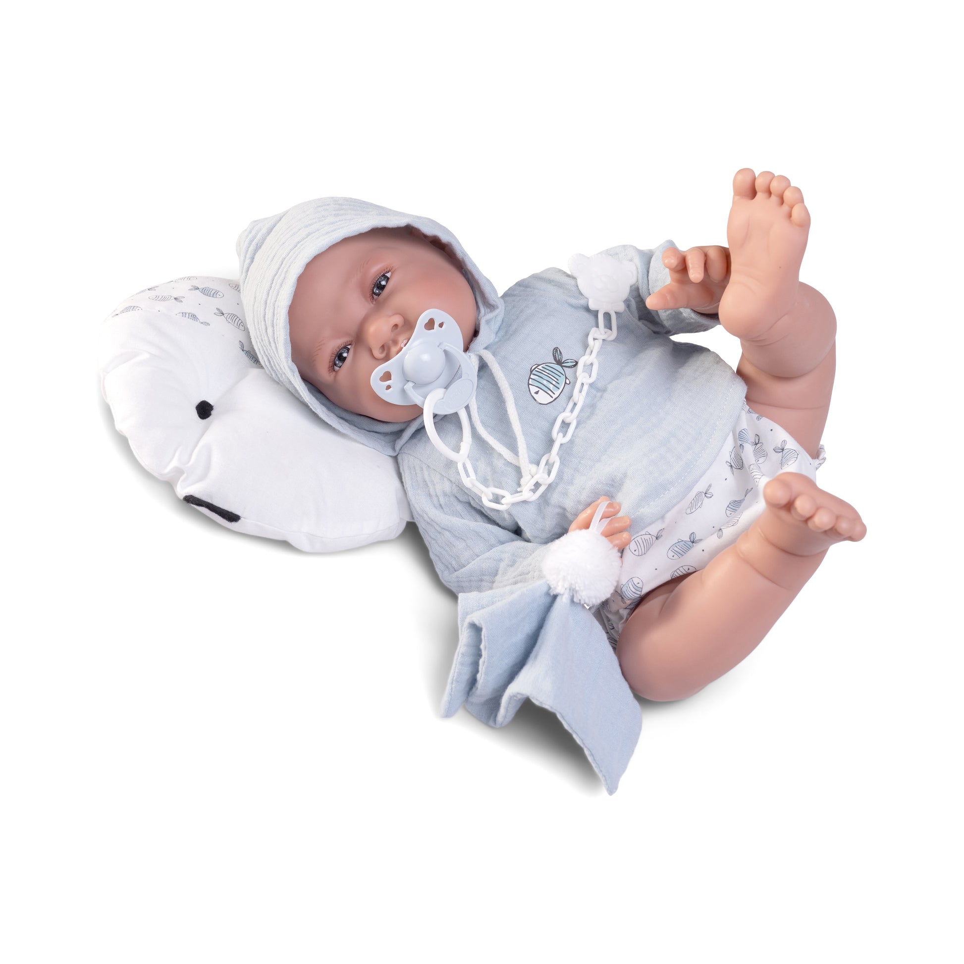 Este adorable Recién Nacido mide 42 cm y pesa 815 gr, y puede adoptar varias posturas gracias a sus extremidades giratorias, que aumentan su realismo y lo hacen aún más parecido a un verdadero bebé.